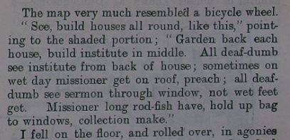 Text reads: “See, build houses all round like this… Garden back each house, build institute in midd. All deaf-dumb see institute from back of house; sometimes on wet day missioner get on roof, preach; all deaf-dumb see sermon through window, not wet feet get. Missioner long rod-fish have, hold up bag to windows, collection make.”