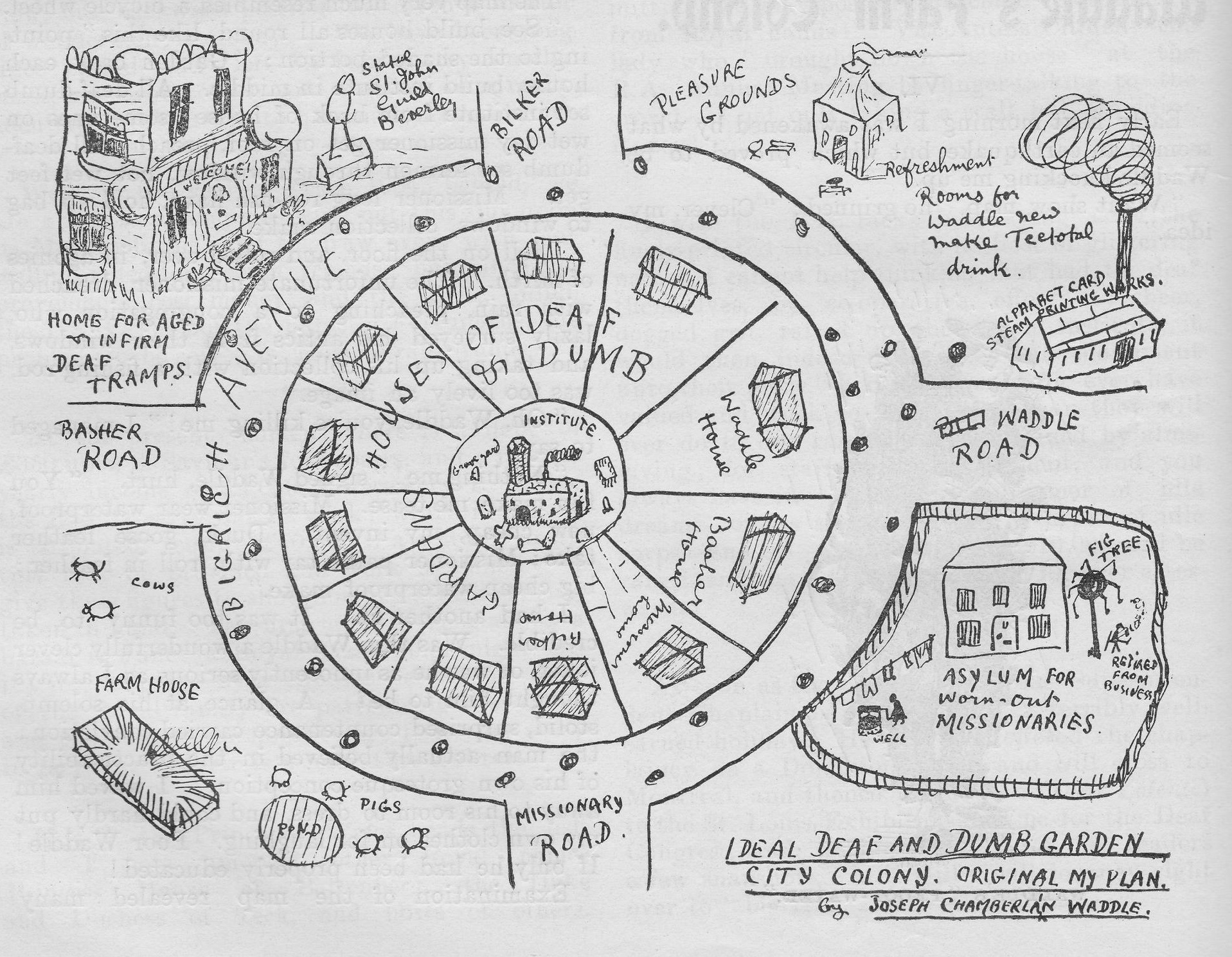 Image shows a cartwheel with the deaf ‘institute’ in the middle and houses all around, situated in their own individual gardens. On the outside of the wheel, are a ‘home for aged and infirm deaf tramps’, a farm house, pleasure grounds, a printing works, and an asylum for ‘worn-out missionaries’.